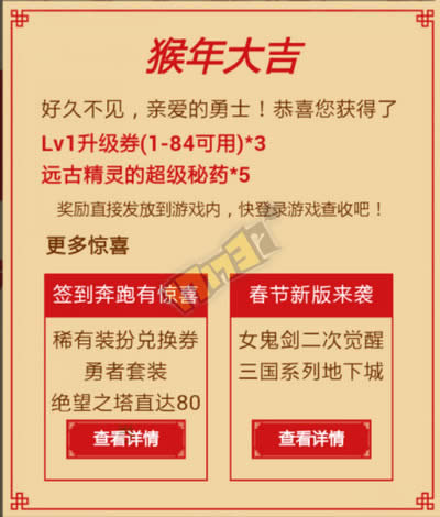 1、1月26日至2月24日活动期间,参与活动,即可获得DNF新年红包一份(打开后随机获得异次元碎片、Lv1升级券、王者契约礼包、深渊派对邀请函中,2-3种奖励);