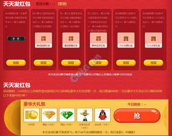 本次春节新加入的一个活动,累计登陆签到可百分百获得红包,另外还可以每天抽两次奖,一次碰运气一次必得。