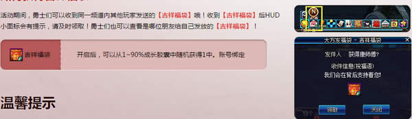 1、活动期间,勇士们可以收到同一频道内其他玩家发送的【吉祥福袋】哦!收到【吉祥福袋】后HUD小图标会有提示,请及时领取!勇士们也可以查看是哪位朋友给自己发放的【吉祥福袋】!