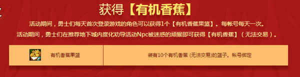 1、活动期间,勇士们每天首次登录游戏的角色可以获得1个【有机香蕉果篮】。每帐号每天一次。