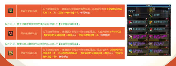 活动期间,除12月24日和12月25日外,勇士们每天首次登录游戏的角色可以获得1个【圣诞节纪念礼盒】。