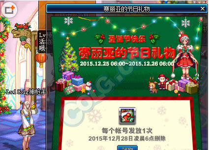 双旦活动,圣诞节&元旦节期间上线,即可领取赛丽亚的节日礼物奖励。