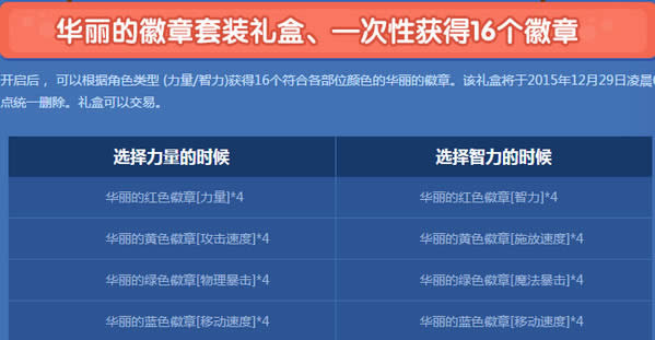 开启后, 可以根据角色类型 (力量/智力)获得16个符合各部位颜色的华丽的徽章。该礼盒将于2015年12月29日凌晨6点统一删除。礼盒可以交易。