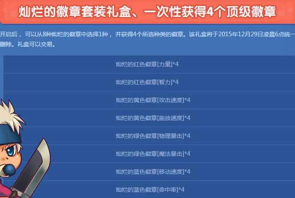 开启后, 可以从8种灿烂的徽章中选择1种, 并获得4个所选种类的徽章。该礼盒将于2015年12月29日凌晨6点统一删除。礼盒可以交易。