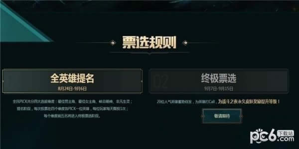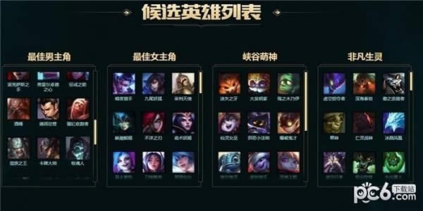 【2】全民PICK共分四大选拔维度:最佳男主角、最佳女主角、峡谷萌神、非凡生灵;提名阶段,每次投票在四个维度各PICK一位英雄,每位玩家每天限投1次;每个维度前五名将进入终极票选阶段。