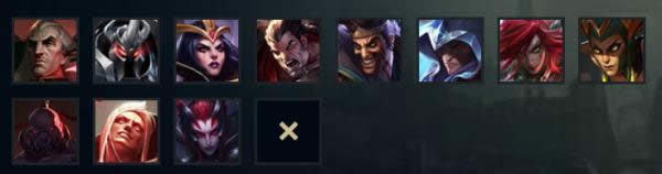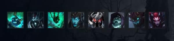 诺克萨首领、 铁铠冥魂、诡术妖姬、诺克萨斯之手、荣耀行刑官、刀锋之影、不祥之刃、魔蛇之拥、亡灵战神、腥红收割者、蜘蛛女皇。