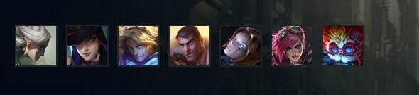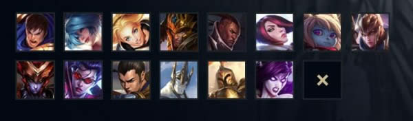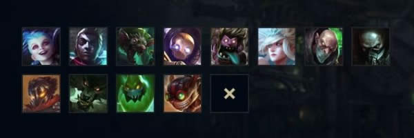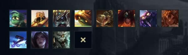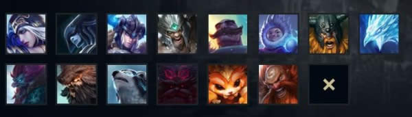 寒冰射手、冰霜女巫、北地之怒、蛮族之王、弗雷尔卓德之心、雪人骑士、狂战士、冰晶凤凰、巨魔之王、兽灵行者、雷霆咆哮、山隐之焰、迷失之牙、酒桶