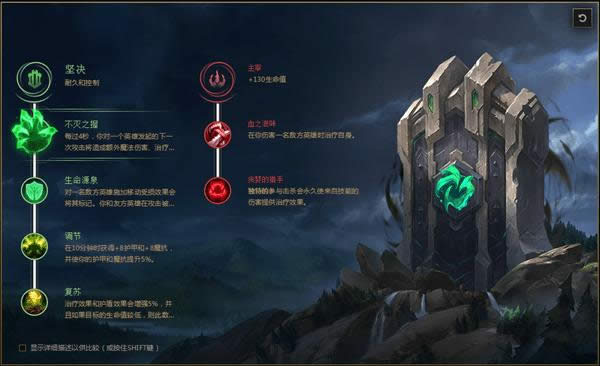 乌鸦是一个法坦,我们就追求血量和吸血,因此点出坚决系里的不灭之握来增加吸血和血量,生命源泉配合W再一步加强吸血,调节增加双抗,复苏增加吸血,副系血之滋味和贪婪猎手都是增加吸血,打团战开着R的乌鸦会非常肉。