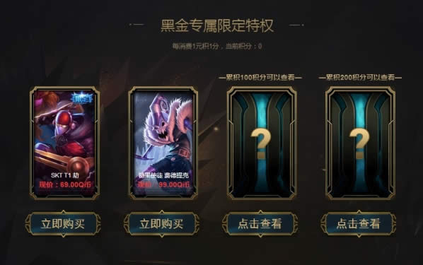 抽取折扣英雄及皮肤 累积积分可查看黑金专属限定皮肤