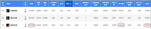 目前石头人的胜率稳定保持在50%左右,对于上单英雄来说是个不错的成绩,补刀数及经济也超越了自己顶头的树人和慎。