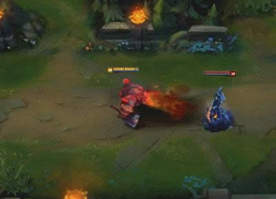 奥恩获得一个护盾,全身喷火,并进入不可阻挡状态。火焰会按照敌人当前的生命值造成百分比的魔法伤害。被技能结束前的火焰命中的敌人会变成易碎状态。奥恩的普通攻击会击退易碎的目标。