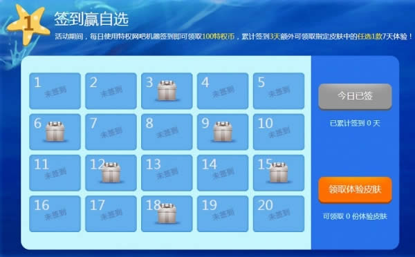 活动期间,每日使用特权网吧机器签到即可领取100特权币,累计签到3天额外可领取指定皮肤中的任选1款7天体验!