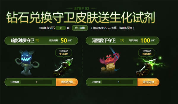 2.使用钻石兑换珍稀守卫皮肤,其中50钻石兑换一份“暗影魄罗守卫(7天)”,赠“生化试剂”一份;100钻石兑换一份“河蟹陛下守卫(7天)”,赠“核能试剂”一份。兑换多份珍稀守卫皮肤,使用时间叠加。