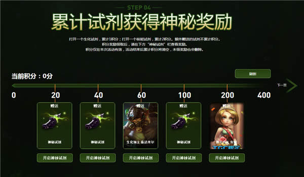 6.打开生化试剂将累计1积分,打开核能试剂将累计2积分。赠送的试剂不累计积分。累计积分达到一定数量,可以获赠神秘试剂好礼