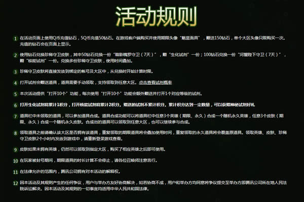 2 使用钻石兑换珍稀守卫皮肤,其中50钻石兑换一份“暗影魄罗守卫(7天)”,赠“生化试剂”一份;100钻石兑换一份“河蟹陛下守卫(7天)”,赠“核能试剂”一份。兑换多份珍稀守卫皮肤,使用时间叠加。