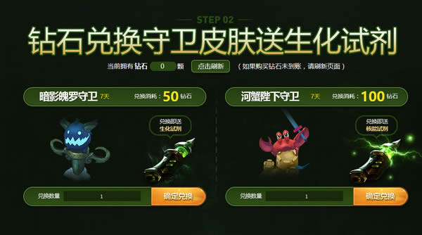2 使用钻石兑换珍稀守卫皮肤,其中50钻石兑换一份“暗影魄罗守卫(7天)”,赠“生化试剂”一份;100钻石兑换一份“河蟹陛下守卫(7天)”,赠“核能试剂”一份。兑换多份珍稀守卫皮肤,使用时间叠加。