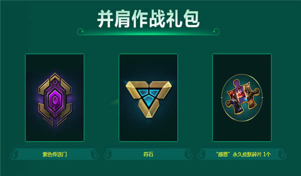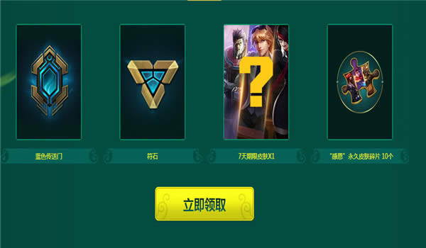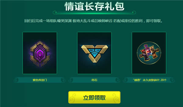 1.为了证明您的回归并顺利领取勇士归回礼包,请登录英雄联盟客户端并完成任意一场游戏(不限模式)再来领取礼包。从好友召唤师获得邀请链接登录本页可以获得额外的“感恩”永久皮肤碎片10个
