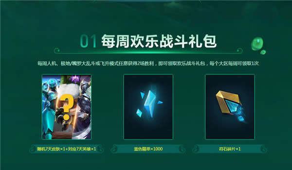 1.每周人机、极地/魄罗大乱斗或飞升模式任意获得2场胜利,即可领取欢乐战斗礼包,每个大区每周可领取1次