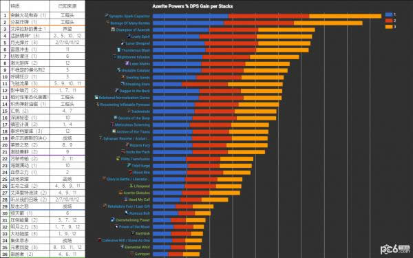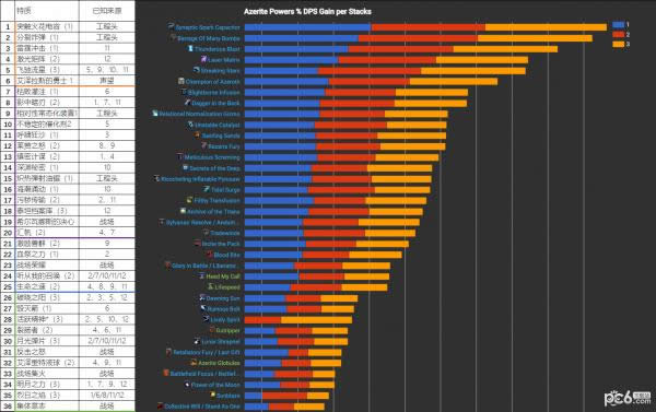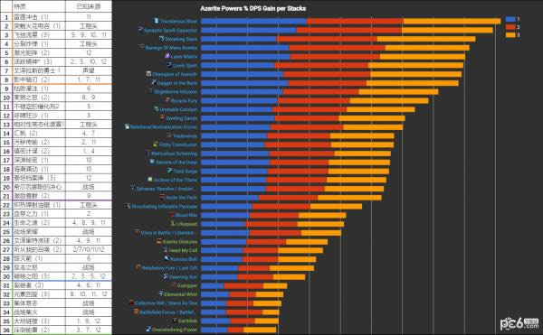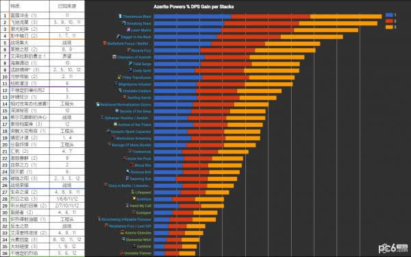 图中左侧为特质翻译,加*号代表治疗特质,艾泽里特特质数量对DPS的影响图中特质后的数字为最大可装备数量。蓝色英文特质代表外圈特质,绿色代表中圈特质。每一条白色竖线代表增加1.2%DPS。