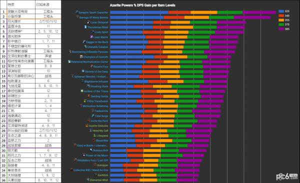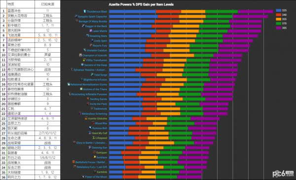图中来源标明为战场的特质均为部落方特质,联盟方特质名称不同,效果相同。 希尔瓦娜斯的决心/安度因的奉献, 战场集火/战场精准, 战斗荣耀/解放者之力,反击之怒/最终赠礼, 集体意志/众志成城。