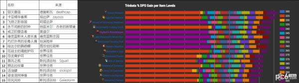 在340装等下,工程头特质领军T1梯队,提升DPS5.55%。同时飞驰流星虽T1垫底仍然表现亮眼,提升DPS3.63%。艾泽拉斯的勇士(3.9%)与枯败灌注(3.56%)、莱赞之怒(3.61%)在T2梯队表现突出,其余特质相互之间差距不大。
