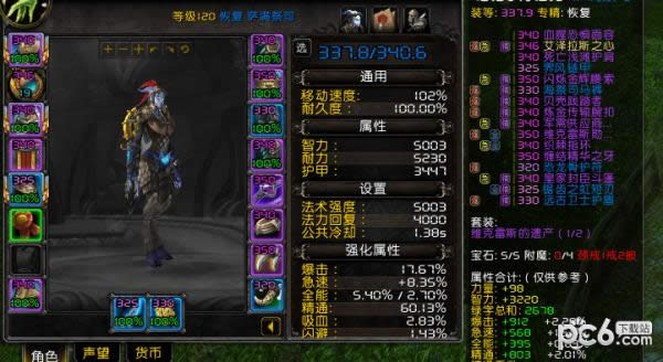4、汹涌狂潮天赋只受到全能加成,不受治疗光环及精通加成,在初期338装等下就有60%精通的条件下,提升的治疗量过低,并且触发治疗条件苛刻(下为人物属性图,完全是有啥穿啥)。