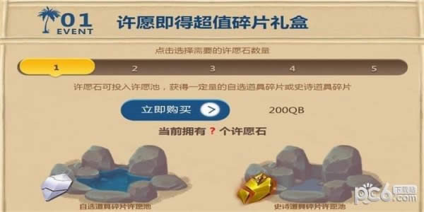 1.点击选择需要的许愿石数量,许愿石可投入许愿池,获得一定量的自选道具碎片或史诗道具碎片
