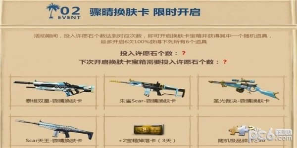 2.活动期间,投入许愿石个数达到对应次数,即可开启换肤卡宝箱并获得其中一个随机道具,最多开启6次100%获得下列所有6个道具