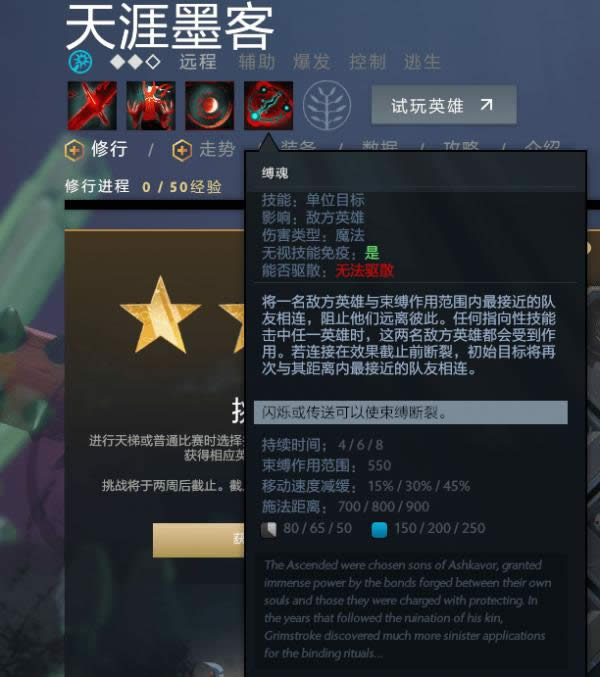 天涯墨客将一名敌方英雄与其距离内最接近的队友相连,阻止他们远离彼此。指向性技能击中任一英雄时,这两名敌方英雄都会受到作用。若连接在效果截止前断裂,初始目标将再次与其距离内最接近的队友相连。
