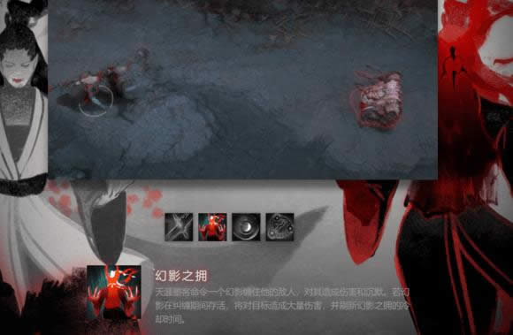 天涯墨客命令一个幻影缠住他的敌人,对其造成伤害和沉默。若幻影在纠缠期间存活,将对目标造成大量伤害,并刷新幻影之拥的冷却时间。