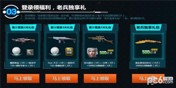 3、活动时间,符合老兵回归资格的玩家,累计登录达到5天可额外领取“老兵独享礼包”一份,单Q限领1次