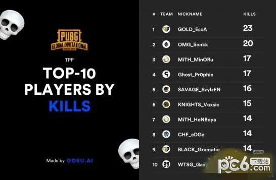 击杀榜上,来自Gold战队的EscA以23杀领跑,OMG的小狮子Lionkk拿到20杀位居次席,泰国猛男MiTH的MinORu和Ghost的Pr0phie同以17杀并列第三。