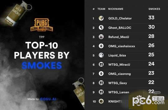 烟雾弹使用榜上,Gold战队的Chelator共扔出33颗烟雾弹成为TPP模式的烟王,Ghost的BALLOC和Refund的MeoU分别以30颗和28颗分列二三位,OMG战队的小海以26颗位居第四,笑容以23颗排在第7位。