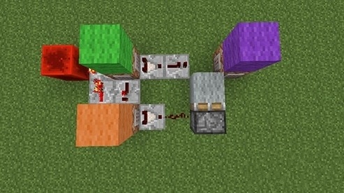 若两个条件达成,激活紫色羊毛处命令方块命令: