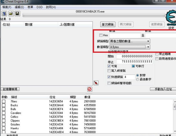 这时候按ALT+Tab返回桌面,点选CE载入进程后,开始准备搜寻薪资和扫描类型选两者之间的数值,