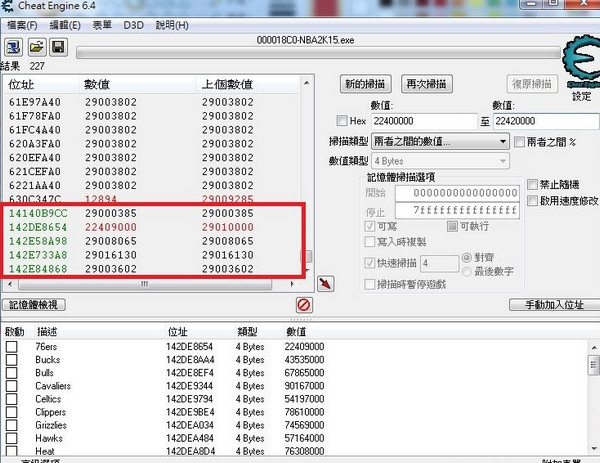 这时再回到CE,搜寻栏左边输入22400000右边输入22420000,然后按下再次搜寻,或者你不搜寻直接看刚刚的那些绿色字体的数字也行。