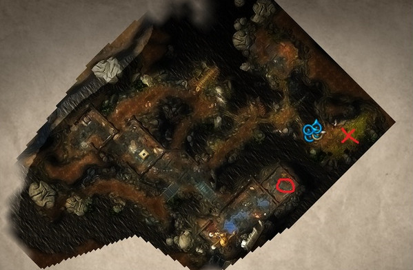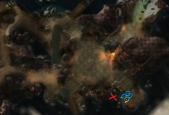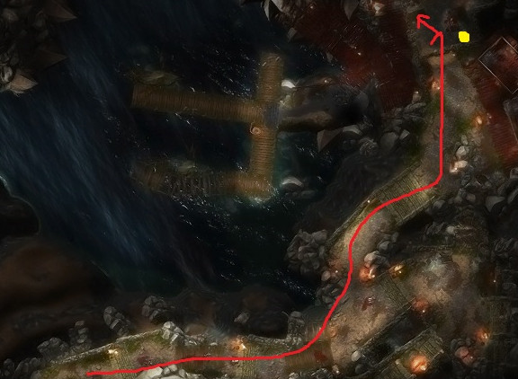 2.复活起来cain,主号一人潜行,无视路上敌人打开黄色处开关进入箭头处地道,开门机关在右图红叉处,站门前利用金字塔把cain拉到身边,然后让cain单独一人贴着左边C潜行到船长身后将箱子拖到物品栏,直接传送到黑湾传送门砸开宝箱得到第3血石。