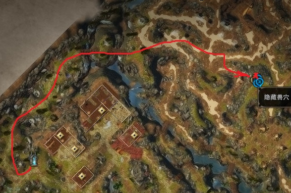 4.银谷出发,不需要接任务,按路线隐身配合潜行,C潜行时可以看到敌人视野范围不进入范围就不会被发现。箭头处是瘸腿人的任务,他正上方即为隐藏兽穴进去再说