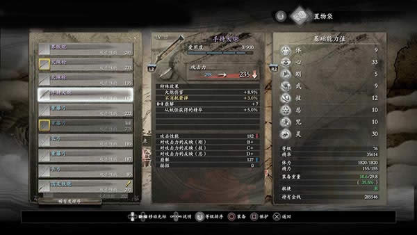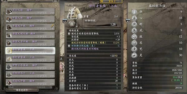 一共分为五个部件,根据佩戴的位置不同,相应的属性值和负重也有不同。而负重则会影响到精力的消耗和移动速度。这里推荐保持负重在50%以下为最佳状态,也没必要一味追求灵活而脱光衣服。与魂系列相比,装备所能提供的防御加成还是非常可观的。