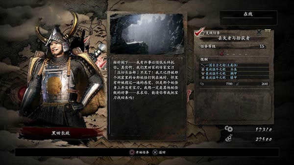 在《仁王》的前期,当你完成了主线“黑暗深处”任务之后,你就能解锁“丢失者与拾获者”的任务。这个任务是黑田长政让你找回他丢失的传家宝压切长谷部。而这个任务堪称《仁王》中最简单的任务之一,因为你只需要击败一个河童就可以达成任务条件。