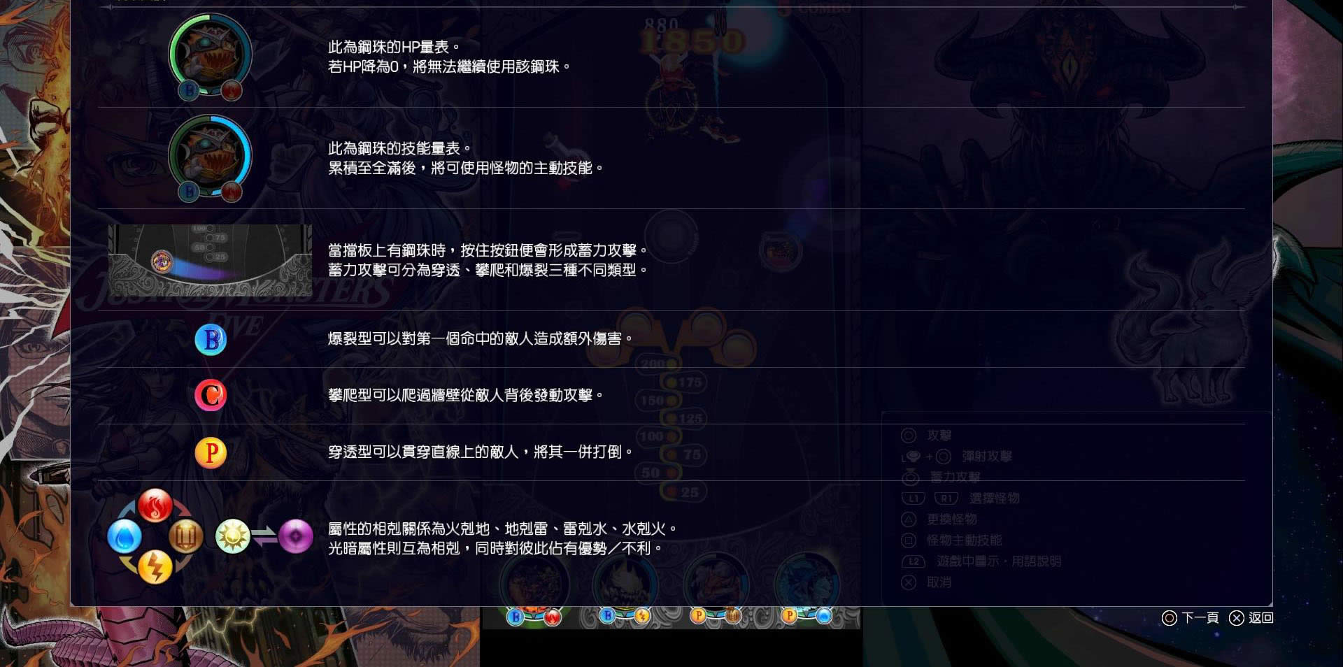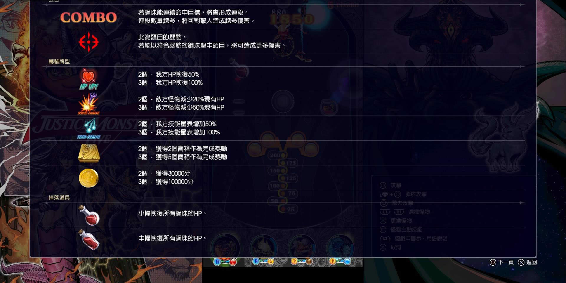 这里需要注意的是,玩的时候有一个小技巧,在使用某个怪物弹球的时候,可以发动其他槽已满的怪物的技能,如果发动成功,场上会暂时多出那个发动技能的弹球。这可以大大增加游戏效率,需要善用。