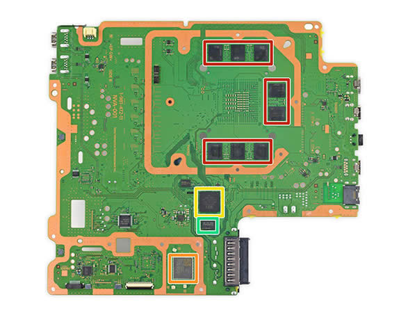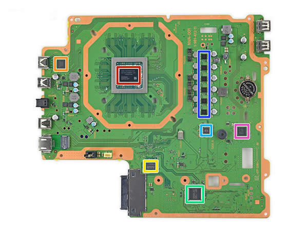 红色:SCEI CXD90044G SoC(包含了 AMD“美洲豹“CPU 和 AMD Radeon GPU)