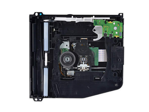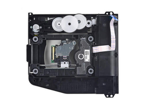 我们如同娃娃机里的夹子般取出光驱。通过卸下一些螺丝和部件,我们打开了光驱发现:有很多弹簧,组装在轨道上的光头,加固措施以及一些可爱的齿轮。
