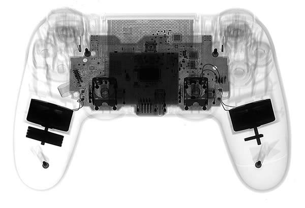 最后,给 PS4 Pro 全部零件来一张全家福,以及下面还有一张新型 PS4 控制器的X光照片。