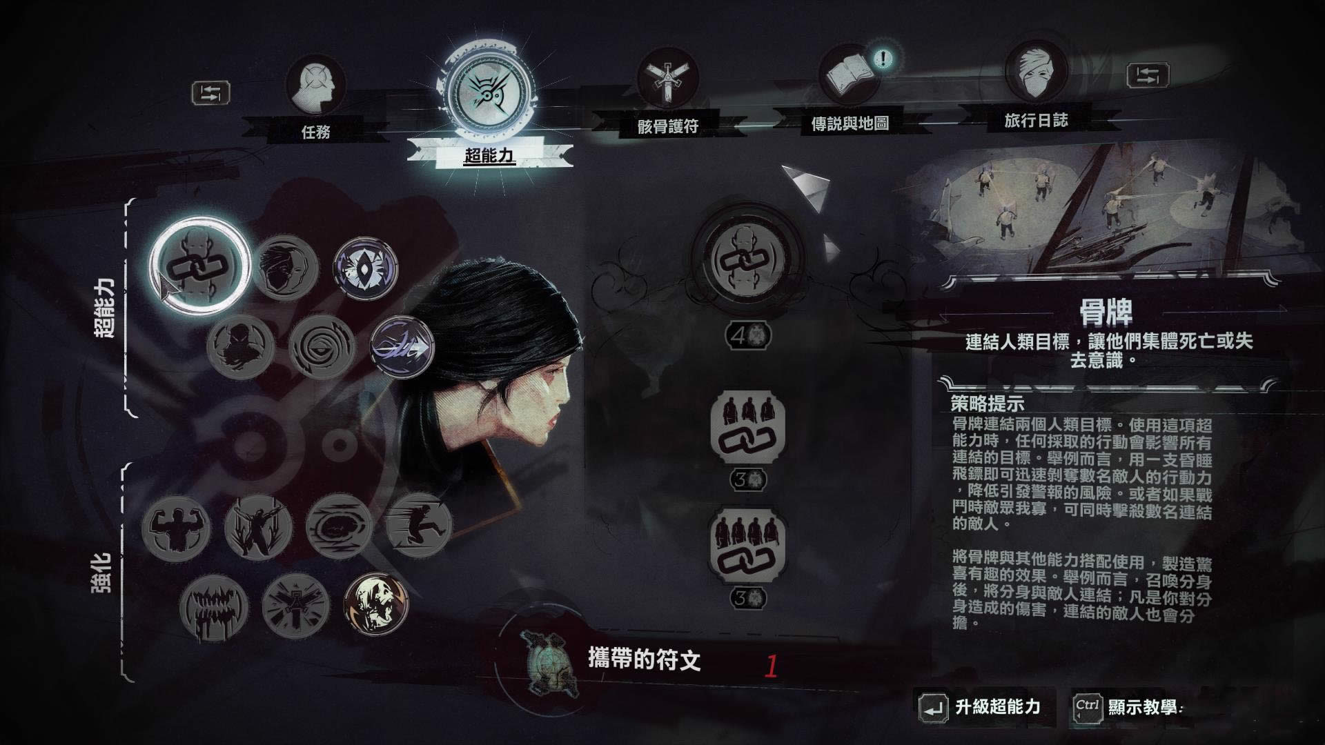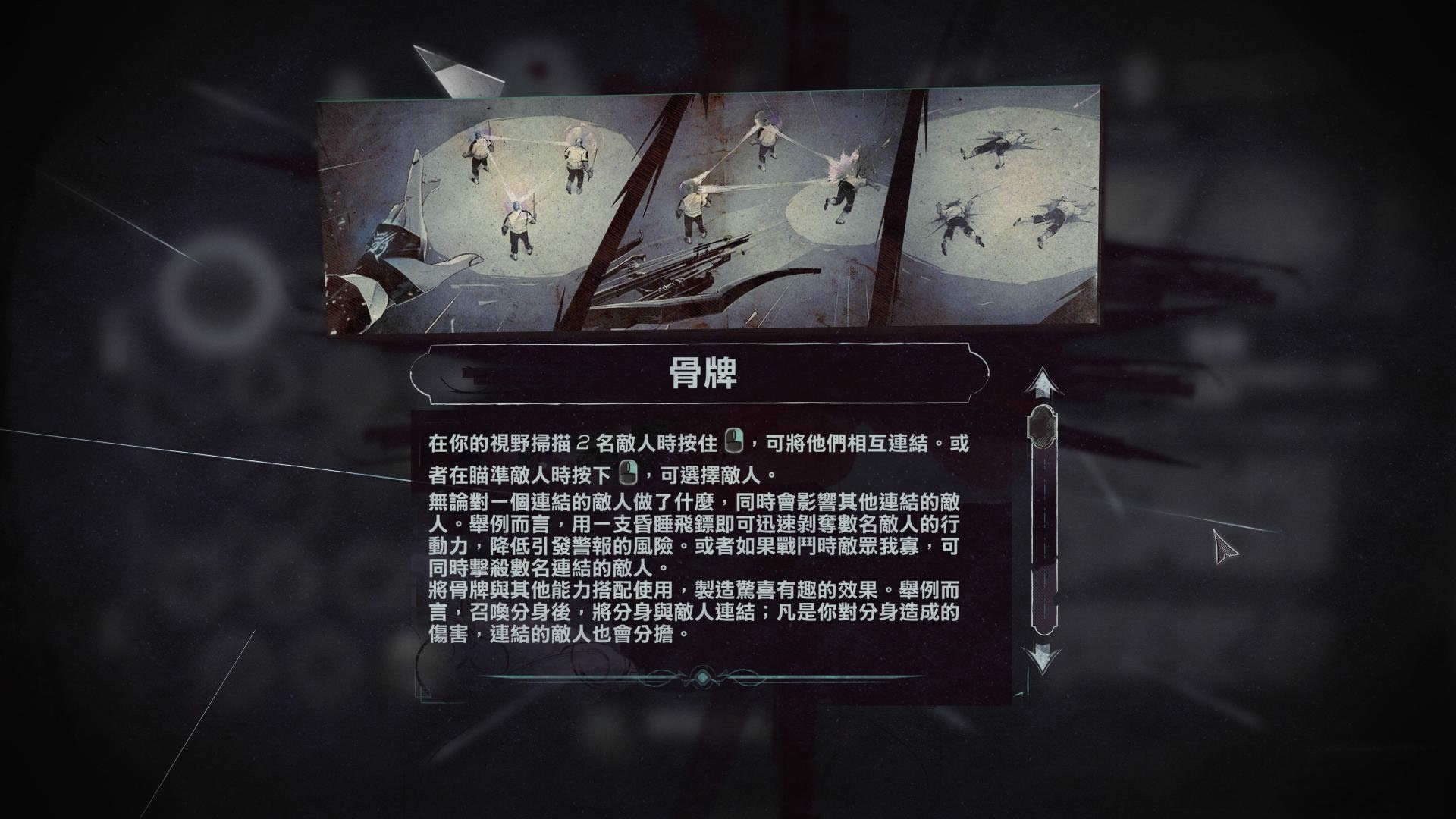 骨牌可以链接两个人类目标。使用这项超能力时,任何采取的行动会影响所有联结的目标。举例而言,你用一支昏睡非标即可迅速剥夺数名敌人的行动力,降低引发警报的风险。或者如果战斗时敌众我寡,也可以同时击杀数名处于联结中的敌人。