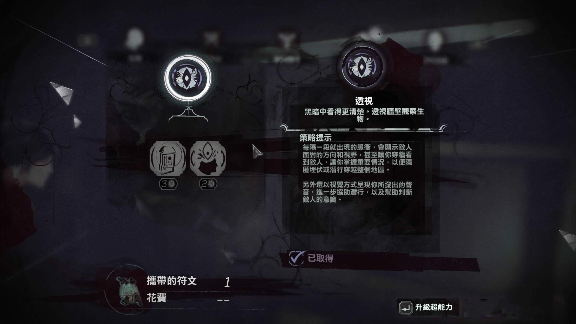 使用透视后每隔一段时间就会出现脉冲,显示敌人面对的方向和视野,甚至让你能穿墙看到敌人,让你得到重要的情况,以便隐匿埋伏或者潜行穿越整个地区。另外还会以视觉方式呈现你所发出的声音,进一步协助潜行,以及帮助判断敌人的意识。