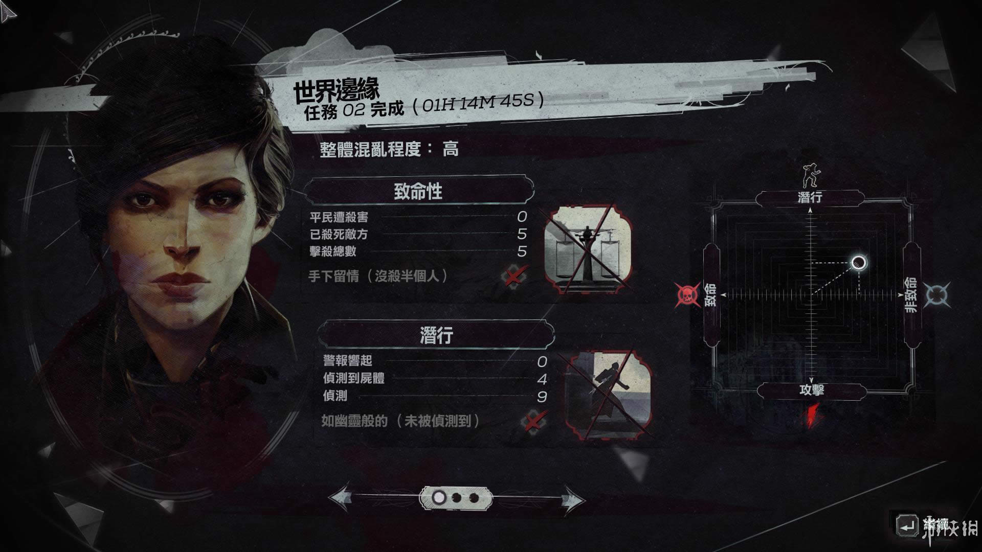 更关键的是,除非你是最初就决定杀遍整条街来通关,否则,游戏进程中每当你作出会导致混乱度变高的行为,都会有一种类似失败的挫败感。关卡结束时的评分统计也是根据玩家有没有进行杀戮以及潜入完美度来进行评估的,所以如果你是相当在意评分和将游戏导向“GOOD END”的玩家,混乱度其实就是一个时刻存在的评分系统。