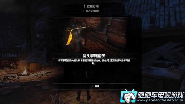 劳拉来到铜矿工厂,跟随“圣三一”的直升机前往旧苏联气象站。索菲亚告诉劳拉,在铜矿工厂附近有个武器藏匿点,或许能派上用场。 在开始处找到营地-铜矿工厂桥梁,从旁边的箱子里拿到新装备-宽头攀爬箭矢。 这种箭矢可以射入软木表面,可以抓住或站到上面,作为攀爬的依靠点。