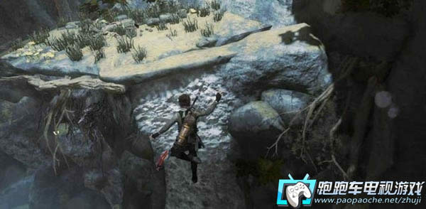 往前有道坡道,滑到末端前起跳,由对面的石壁攀爬上去。