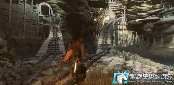如图所示,这个场景有两条轨道。谜题的目标是释放两条轨道上面的两辆矿车,用来撞开藏宝室的两道木栅门。